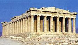 The temple of Athena Parthenos on the Acropolis at Athens, started in the early 5th century BC, but re-designed and completed under Perikles, about 450-430 BC. Iktinos was the architect, and Pheidias was the principal designer of the sculpture. It was the greatest and most subtle of all Greek classical temples. Its rear room housed a Treasury, and it was the goal of the annual Panathenaic processions, but had no altar of its own, the older Athena Temple altar being used.