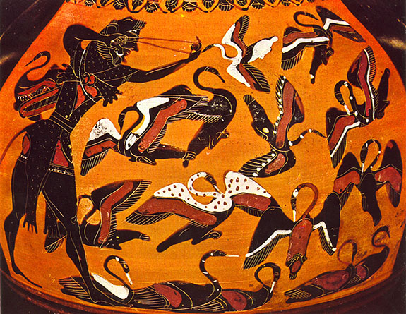 Man-eating birds living on Lake Stymphalus in southern Greece. Herakles had to kill them as his sixth Labour. He did this with a bow or sling.