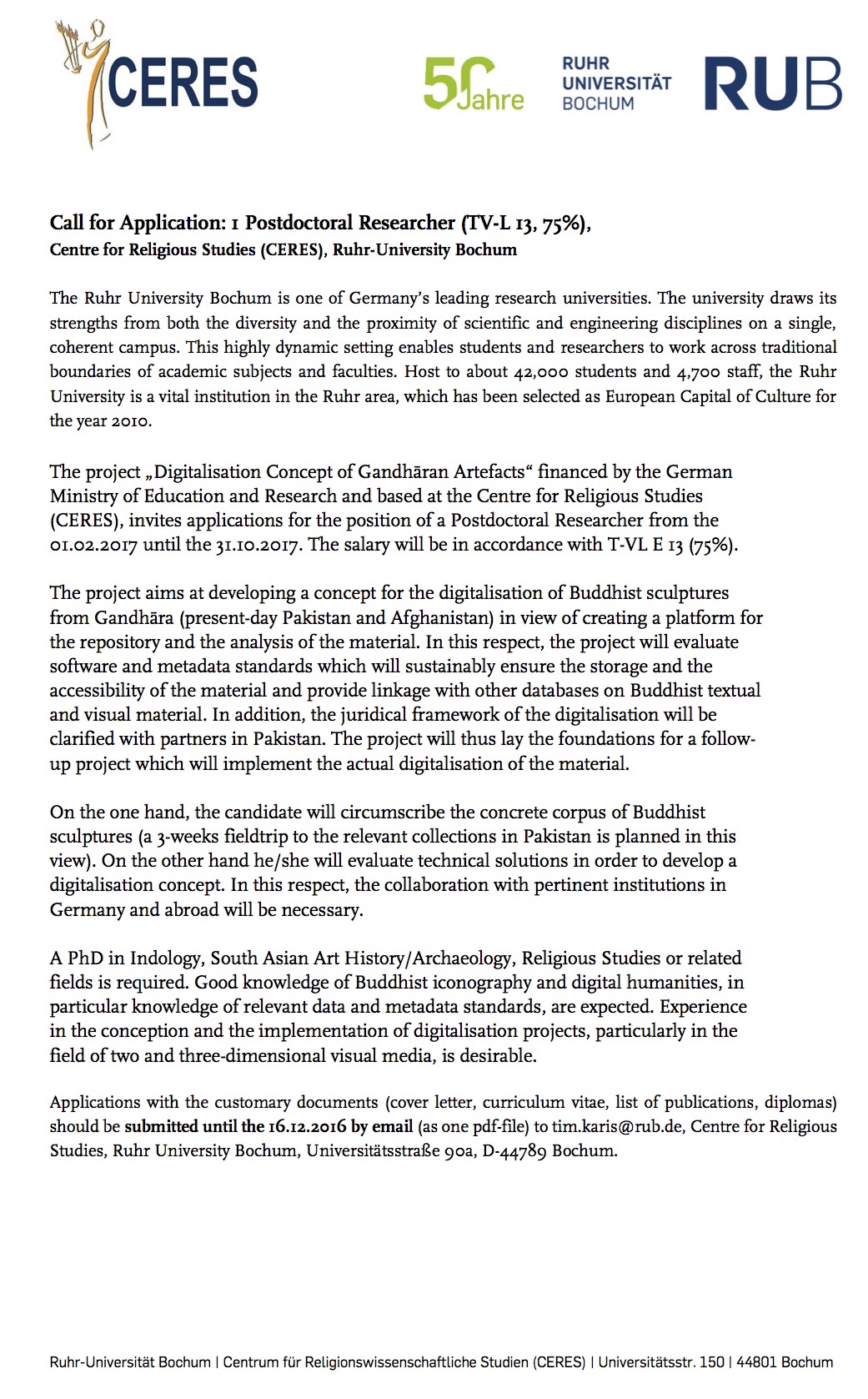 Our colleagues at CERES (Centre for Religious Studies) at the Ruhr Universität Bochum, are launching a proof-of-concept project for the digitization of Gandharan sculptures in Pakistan and have advertised the following postdoctoral position. The project is co-directed by Dr Jessie Pons, a member of the Gandhara Connections Advisory Committee:-